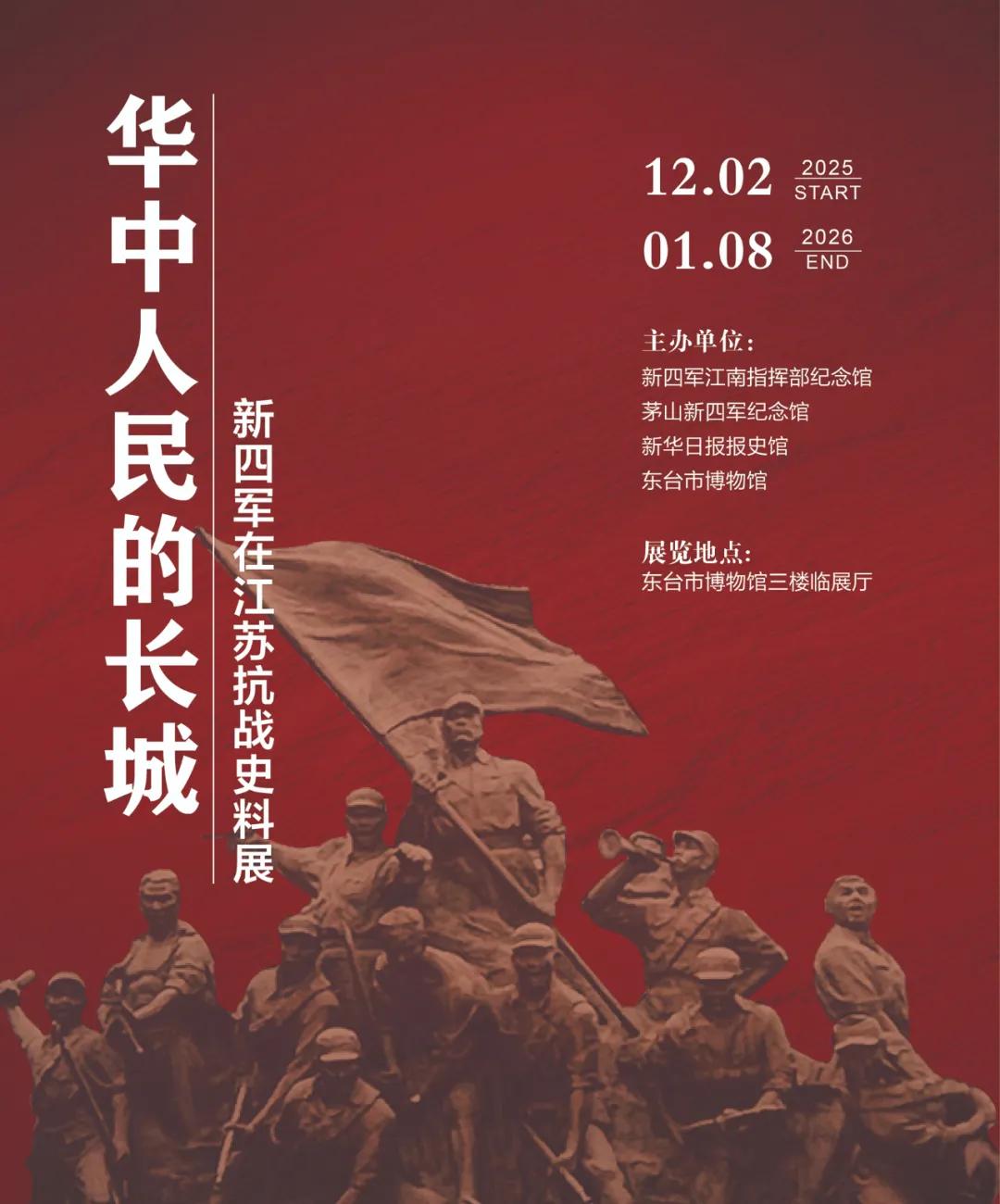 12月2日,由新四军江南指挥部纪念馆、茅山新四军纪念馆、新华日报报史馆、东台市博物馆主办的《华中人民的长城——新四军在江苏抗战文物史料展》在东台市博物馆开展。展览以“抗日救亡 铁军诞生”“东进北上 发展华中”“浴血江淮 坚持抗战”“依靠人民 发展壮大”“战略反攻 赢得胜利”五大板块,通过武器装备、档案文书、军民生产生活用具等珍贵文物,生动再现新四军在江苏的抗战历程,深刻诠释“华中人民的长城”所承载的团结抗战精神与军民鱼水深情。