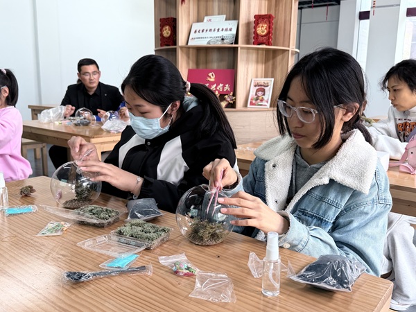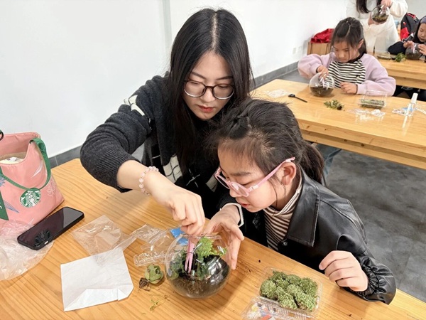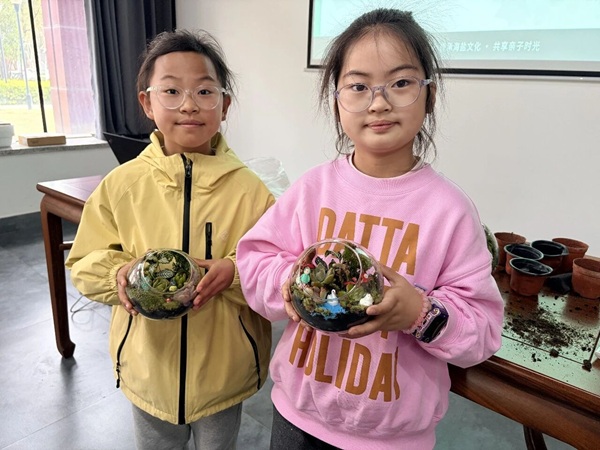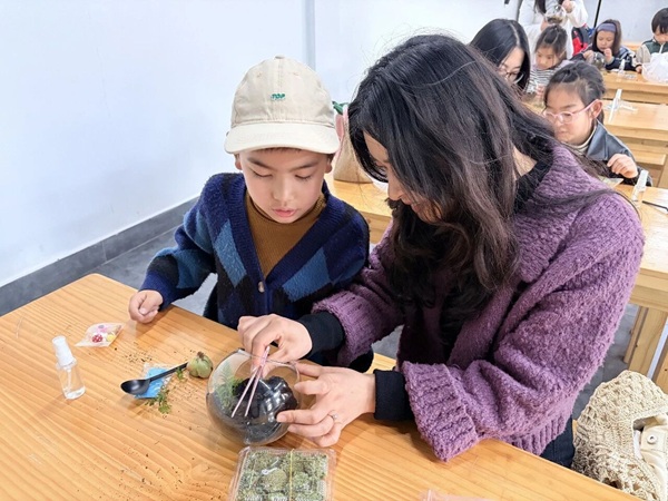 活动中,社教老师以苔藓科普为引,讲述其坚韧扎根、细微绽放的品格,并现场演示铺土、造景、栽种、装饰等制作流程。亲子家庭携手协作,巧手打造专属微景观,于方寸天地间定格自然生机。孩子们踊跃展示作品、分享感悟,在欢声笑语中定格美好瞬间。